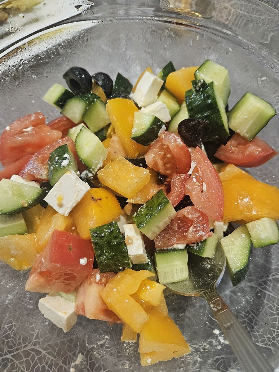 Все дуже просто - підсмажила курячі стегна, зварила «пірʼя», відкрила пачку оливок. На інше не було ні часу, ні сил, ні світла. Тому так