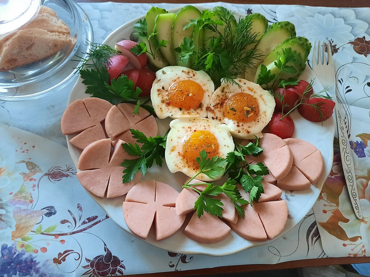 Если яичница без овощей, то + салат любой свежий или квашеная капуста