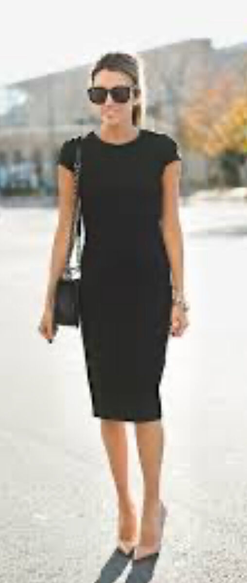 К черным туфлям можно и черные. И вариант, когда все бежевое ниже платья, удлиняет ноги.
