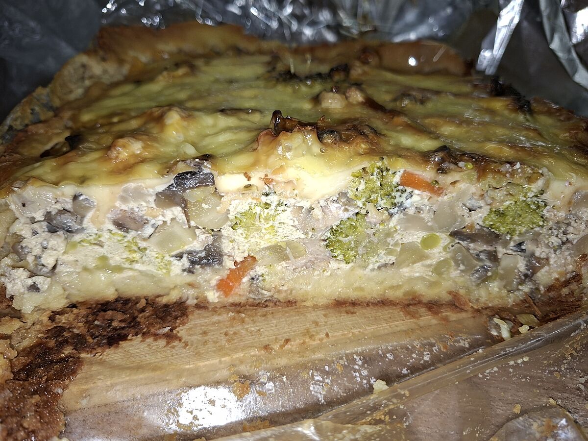 Начинка - курочка, гриби, цвітна капуста, броколі, синя цибуля, трохи моркви.