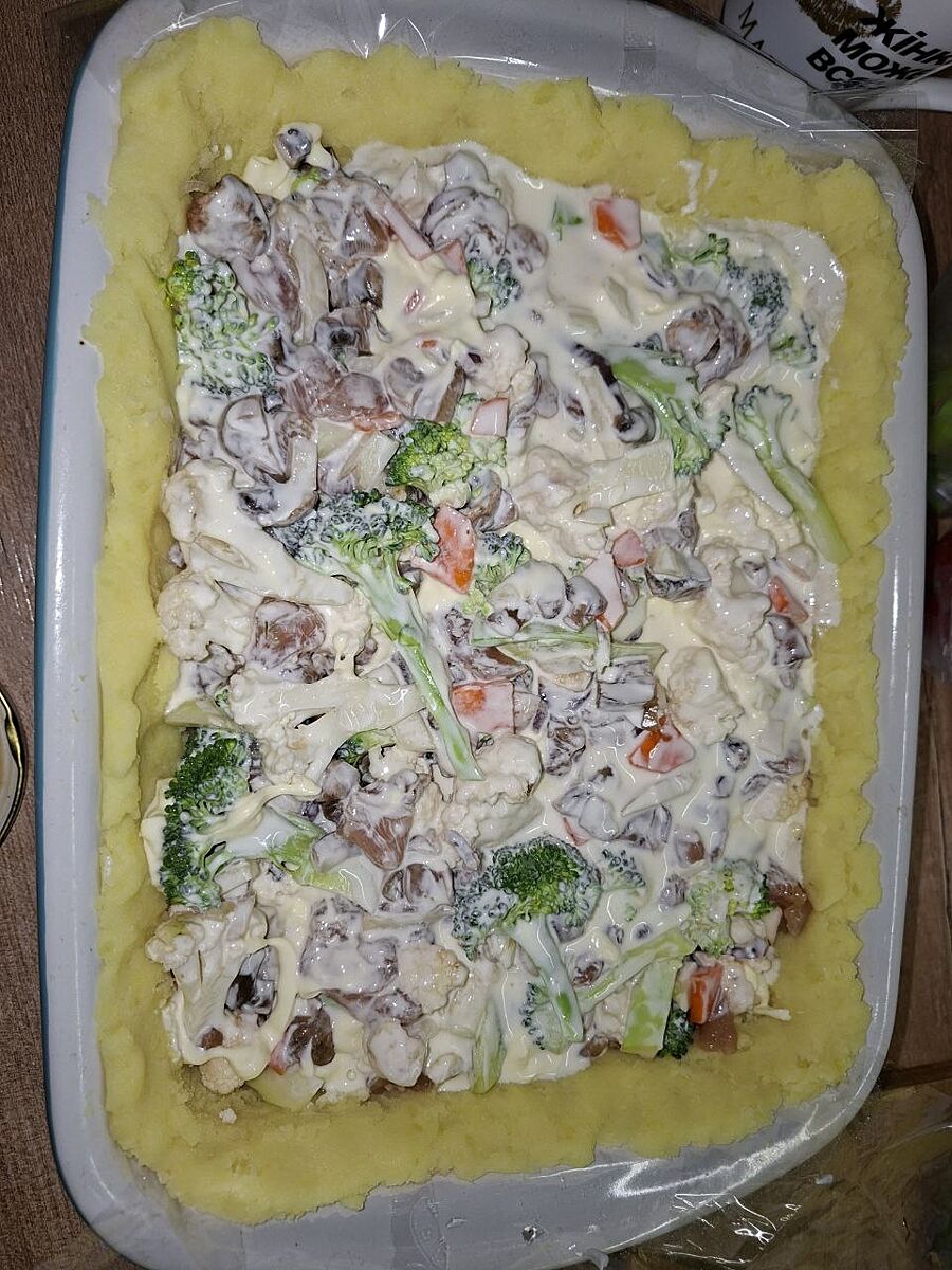 Начинка - курочка, гриби, цвітна капуста, броколі, синя цибуля, трохи моркви.
