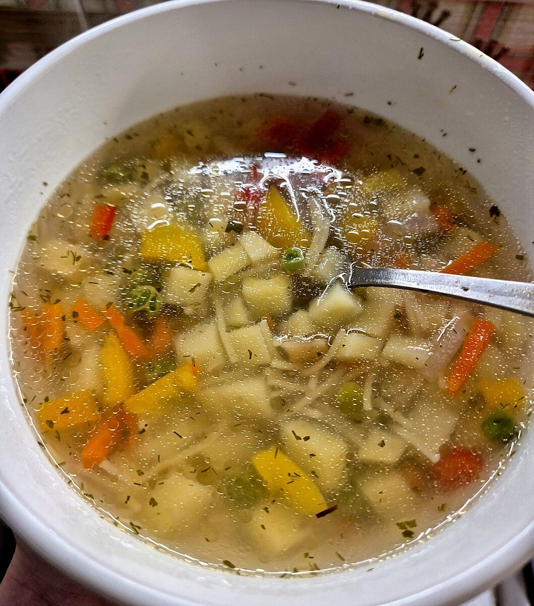 У меня супчик( 2 брикета ролтона, и 4 пакетика супчика куринного сухого своя линия залить кипятком)