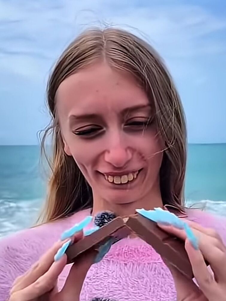 Она вечно на камеру то печеньем хрустит, то ещё чем нибудь, на этих роликах деньги зарабатываем. Молодец! Смогла продать свою особенность выгодно.