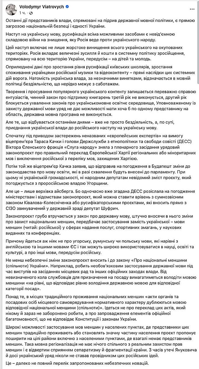 Ініційовано законопроєкт, який посилює роль російської та інших мов національних меншин, — нардеп В’ятрович із посиланням на громадські організації.