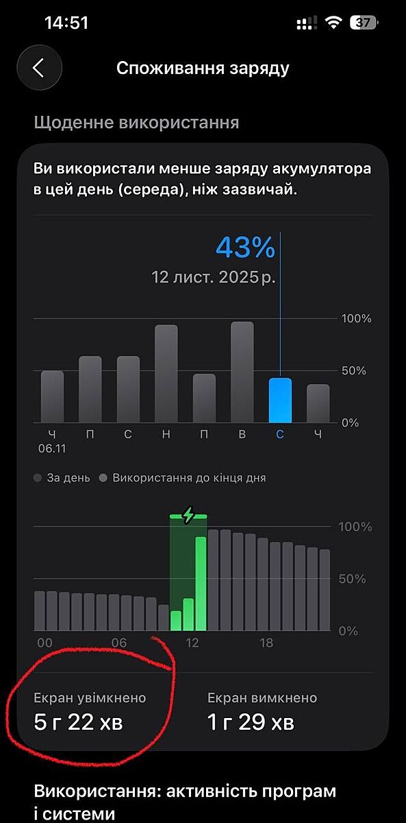 Я писала про 2 дні при активному екранному часі 5 годин, і це не брехня, саме в 16е урізали модуль камери, і за рахунок цього запихнули більшу батарею, ніж в інших маленьких. Ну і частота оновлення екрану менша, відповідно менше заряду споживає. Там, де на скріні весь заряд за день - 11 годин активного екранного часу, хворіла і цілий день гортала рілси, а так в середньому в мене десь 50% заряда йде за день.