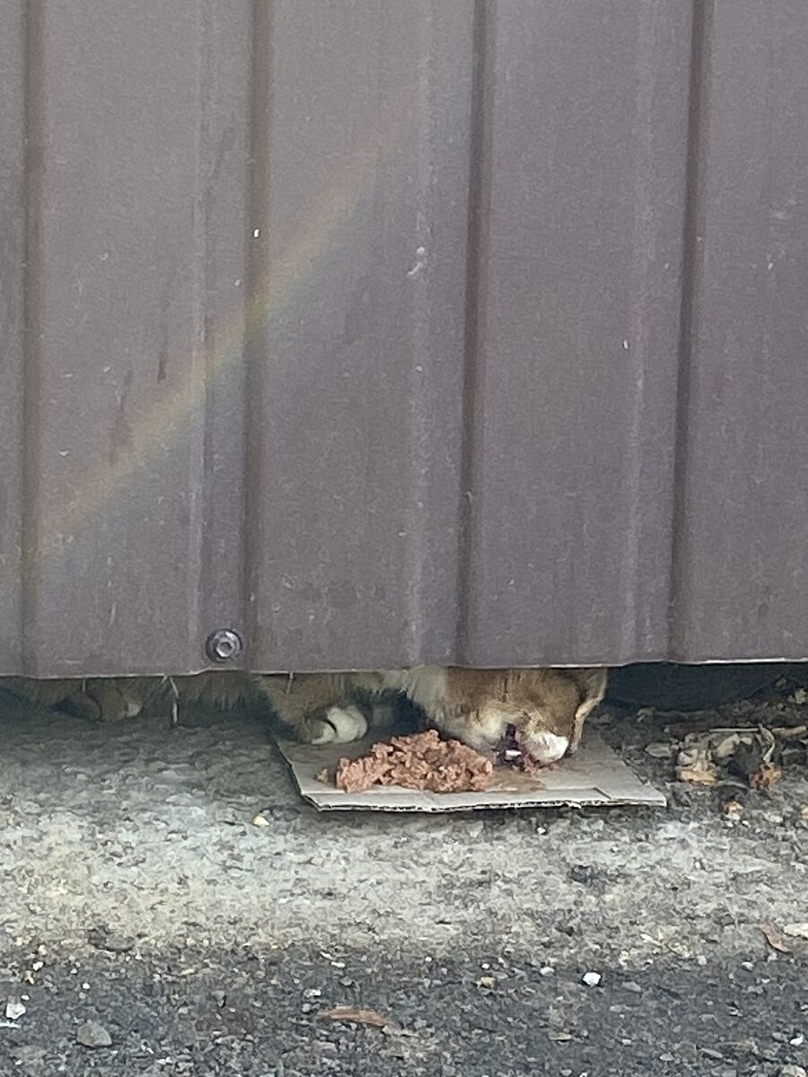 Две недели назад проезжая мимо мусорки в селе увидела кота/кошку на баках. У меня с собой сметана была отлила ему немного, вышел поел (баки закрыты забором и под крышей)