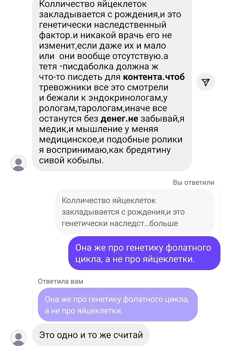 В Инста мы часто скидываем друг другу ролики. На днях я отправила ей ролик о нарушении фолатного цикла, и о том, что этот анализ можно сдавать и девочкам - это может помочь избежать проблем в будущем (у неё девочки, у меня мальчики). Просто ролик, без каких-либо комментариев.