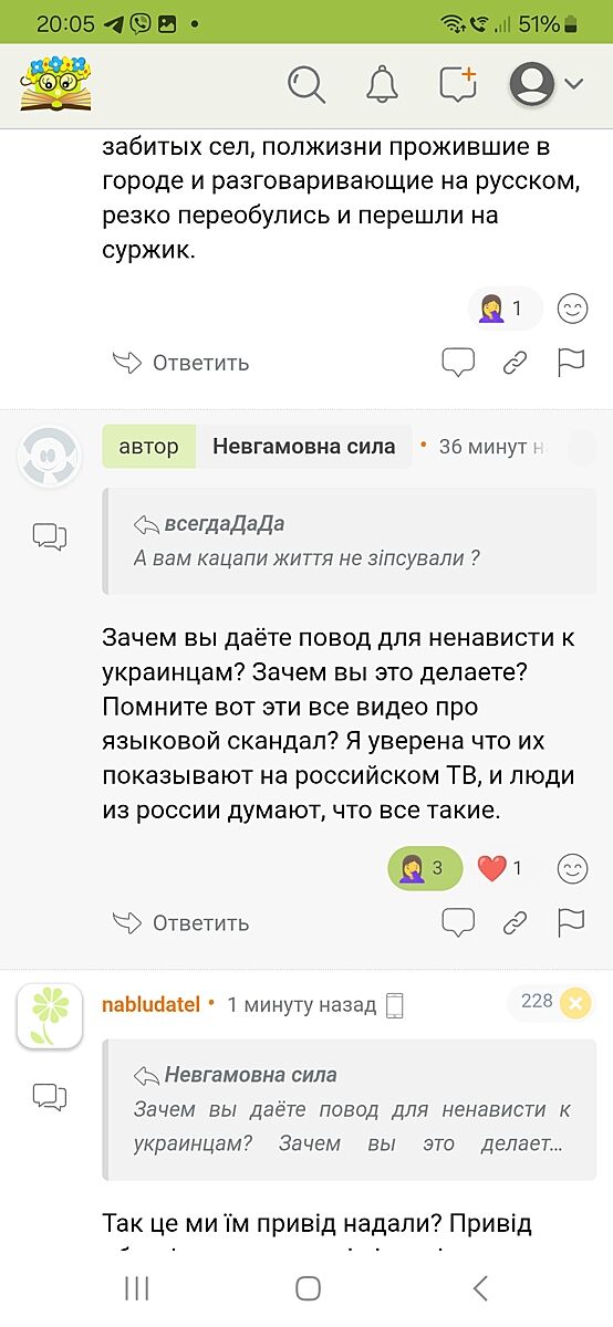 Зачем вы даёте повод для ненависти к украинцам? Зачем вы это делаете? Помните вот эти все видео про языковой скандал? Я уверена что их показывают на российском ТВ, и люди из россии думают, что все такие.