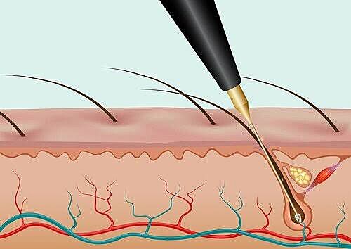 Вот хорошо показано что стреляют в основу луковицы, где идет подпитка сосудами, там образуется рубец. Электро, при грамотном враче, убирает луковицу с одно раза, все что растет потом это спящие или новые луковицы . Многие мастера превышают дозу и появляются рубцы и раны после электроэпилиции