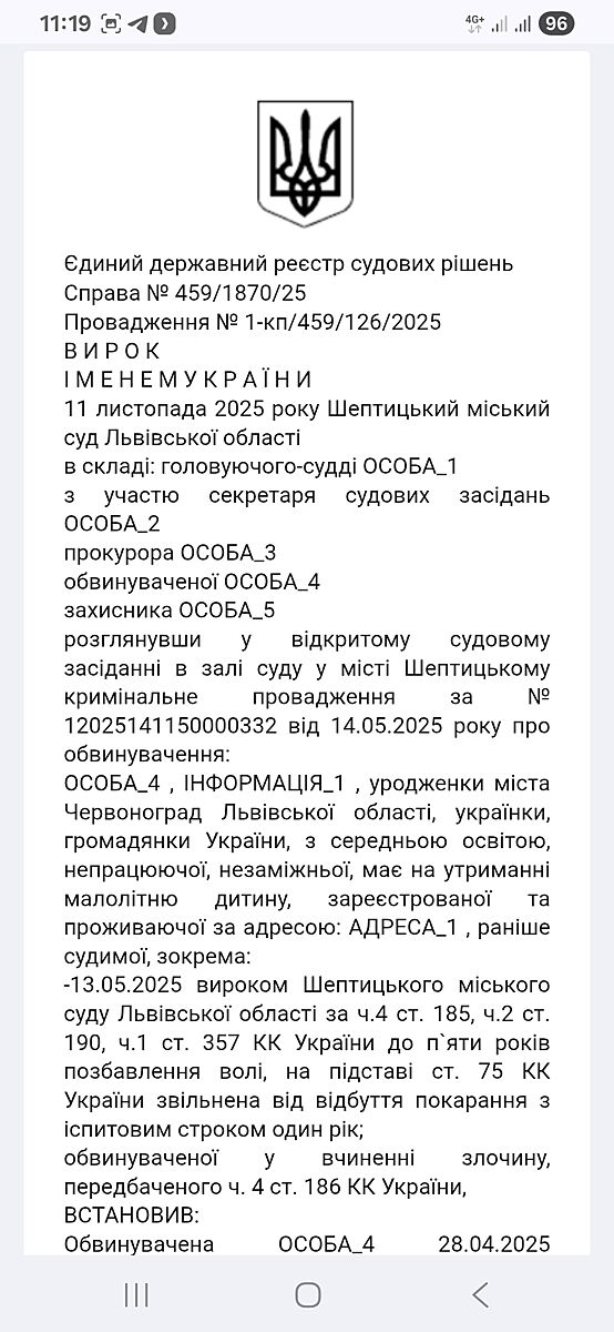 "В Шептицькому (колишній Червоноград) мати-одиначка отримала 5 років позбавлення волі за те, що вкрала в магазині "Рукавичка" ковбасу. Суд у справі № 459/1870/25 педантично встановив, що ця зловмисниця викрала ковбасу "Папероні", вагою 264 грами, снекову ковбасу "Золотиста" 258 грамів, дві пачки плавлених сирків «Sertop» по 130 грамів кожен. Тож, зловмисниця завдала ТОВ ТВК «Львівхолод» майнову шкоду на загальну суму 574 гривні 87 копійок. На суді вона сказала, що продукти харчування викрала для власного споживання, оскільки не мала грошей на їжу. "
