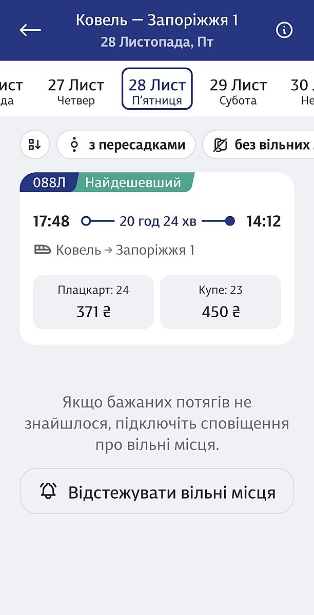 Подскажите пожалуйста есть ли сейчас поезд Ковель Запорожье?