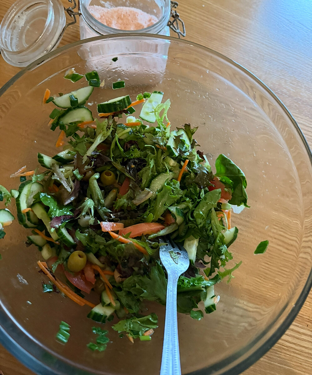 Картошку жарену чоловік їв десь о 18, я жарила відбівні з малою з´їли десь годину назад, каву 3 в 1 випила з еклером, може пізніше з´їм мандаринку. Не розумію салат грудка та хлібци з авокадо. Чисто на мій смак.