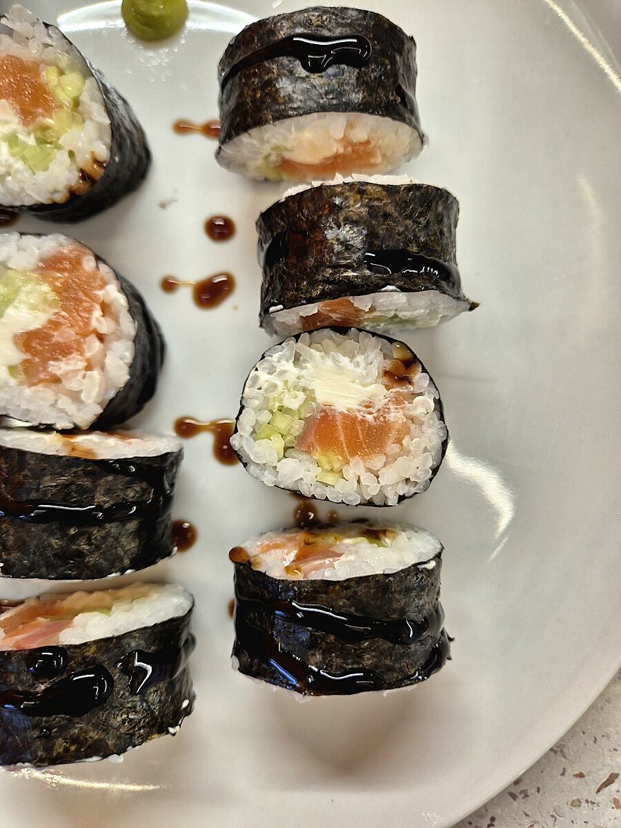 Покажу свои первые в жизни ролы, готовила на НГ прошлый. С тех пор так и готовлю дома, иногда с копченым угрем (в Варусе и МЕТРО есть маленькие упаковки, недорого). Нори нашла на свой вкус методом проб. Когда дома есть рис, уксус, васаби, то уже не так и накладно. Семгу беру по акции, всегда есть в холодильнике и морозилке. Короче простые ролы это совсем не накладно и в отключения вы уверены в свежести.