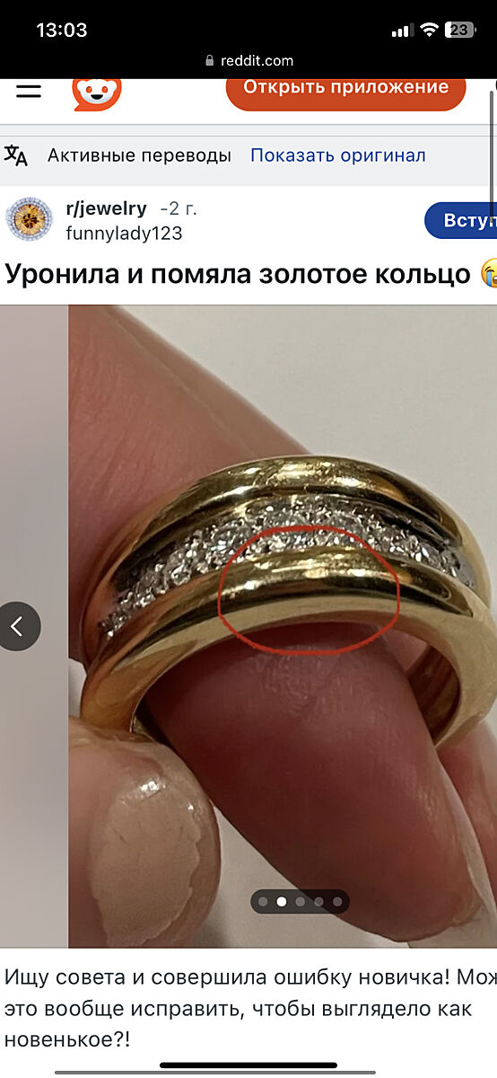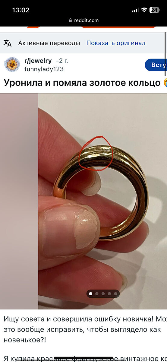 Дальше я начала больше гуглить как выглядят вмятины и рассматривать свое кольцо уже при дневном цвете.