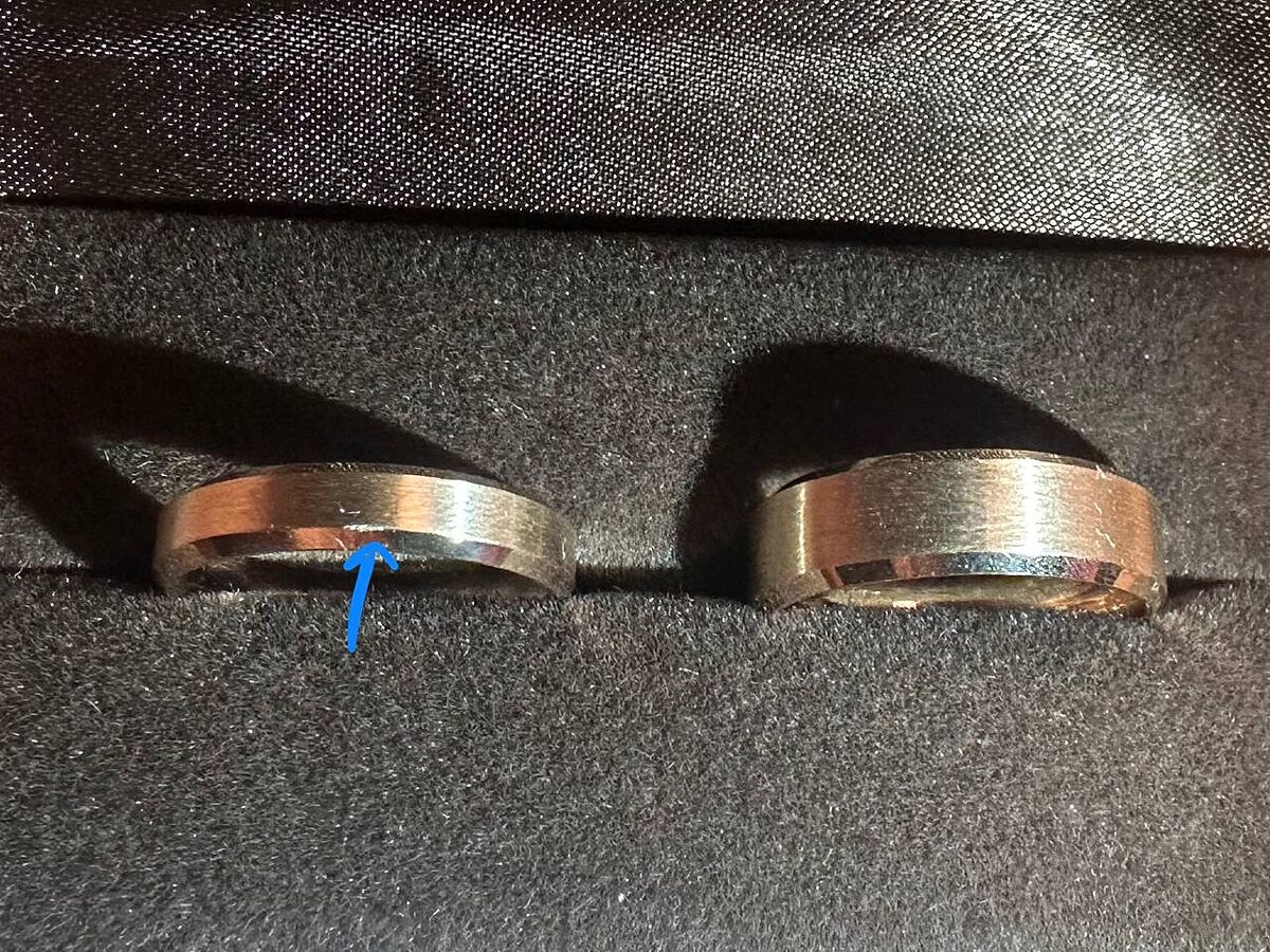 Это капец. В общем, сейчас пошли в ванную, я взяла свои старые золотые кольца, которые покупала в Украине и начала их бросать с силой, но ничего на них не появилось. Они ровные как были так и есть. И тут решила еще раз бросить это обручальное кольцо и тут появился малюсенький новый скол с другой стороны . Я в диком шоке. Уже точно не хочу обмен, просто будем просить полный возврат колец и денег