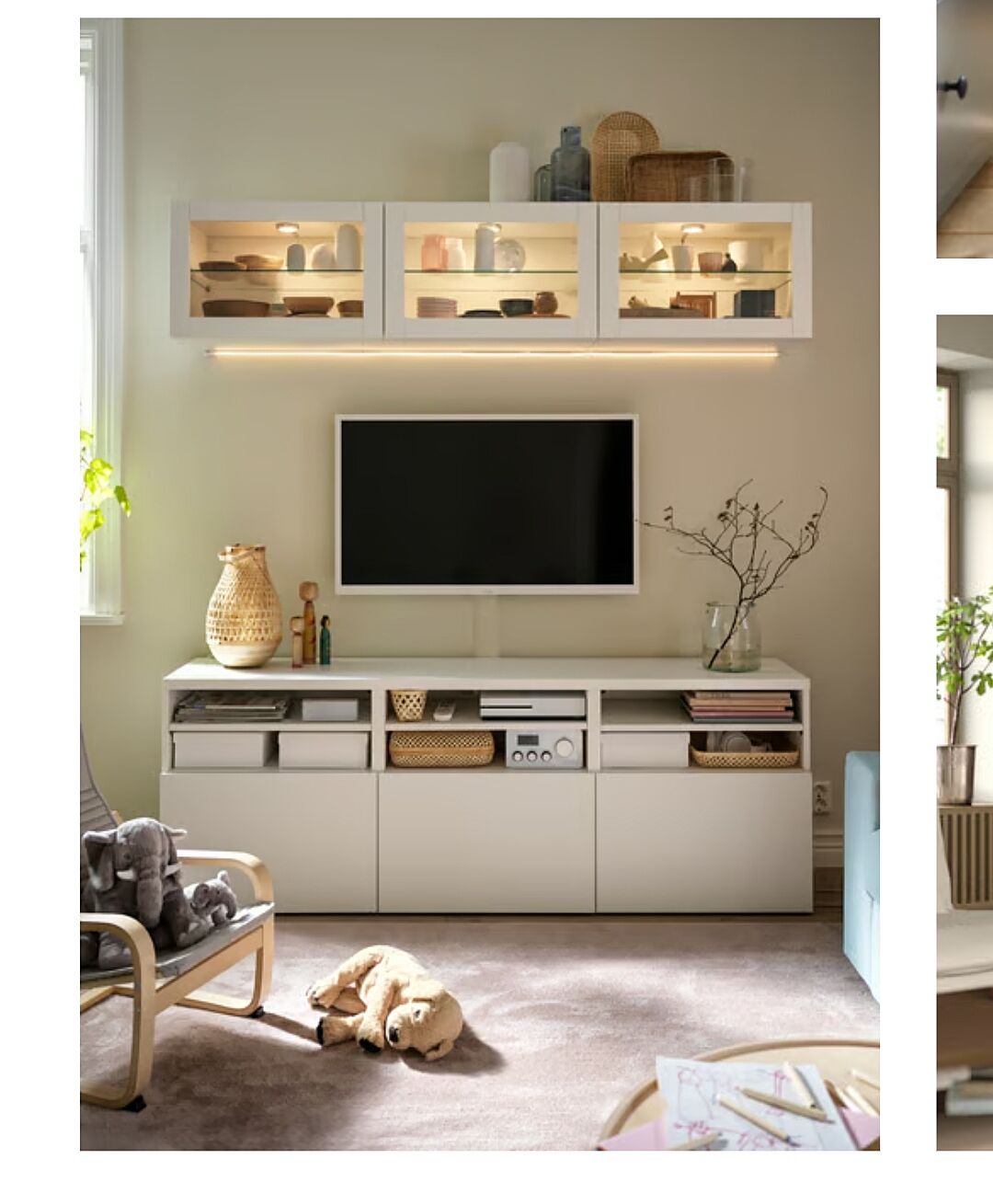 Полка под телевизором. И антресоли над ним. Рабочую зону можно сделать с откидным столом.