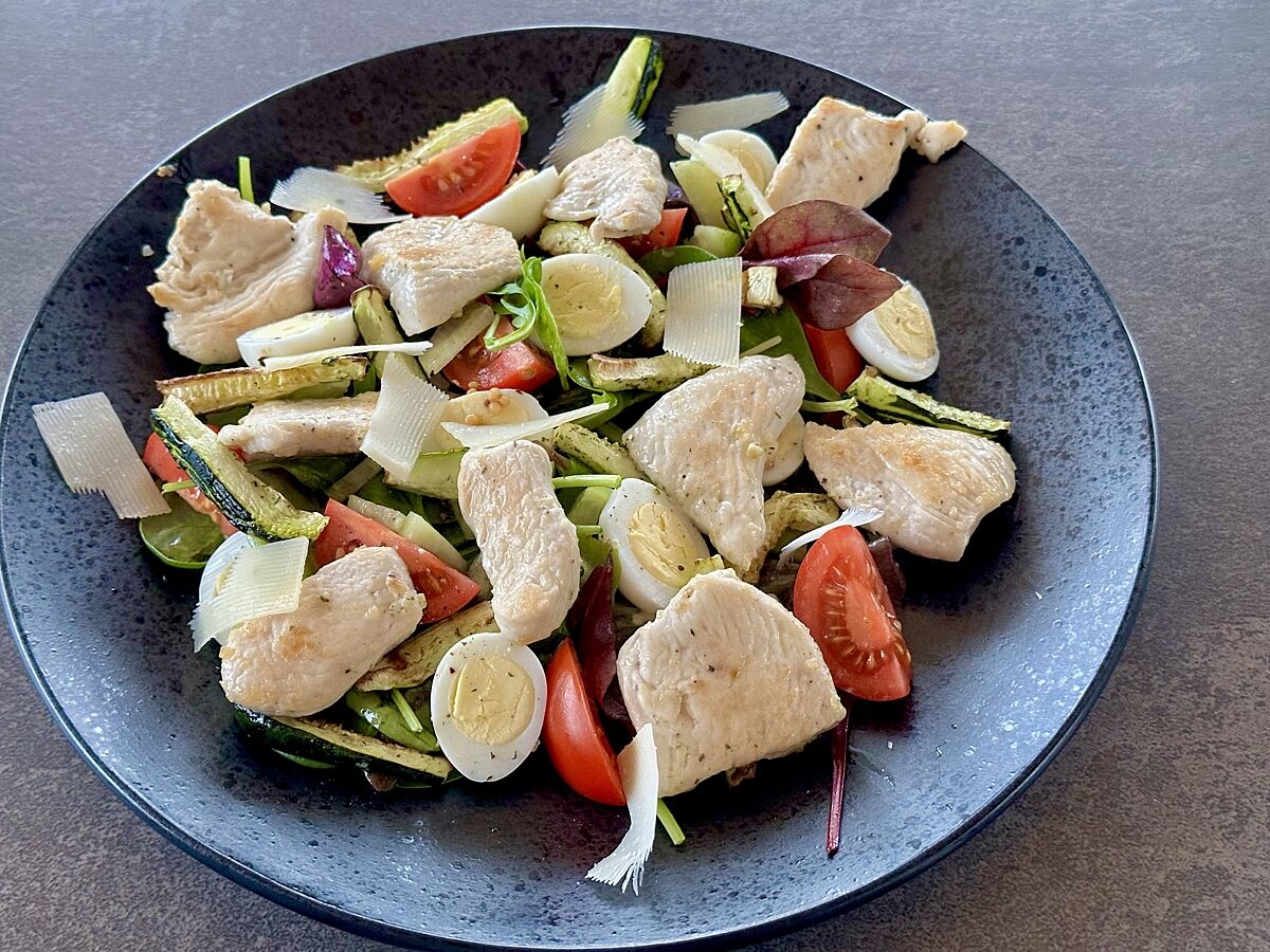 У меня обеды на работе, сегодня был обалденный чесночный суп и на второе индейка с макаронами и салат