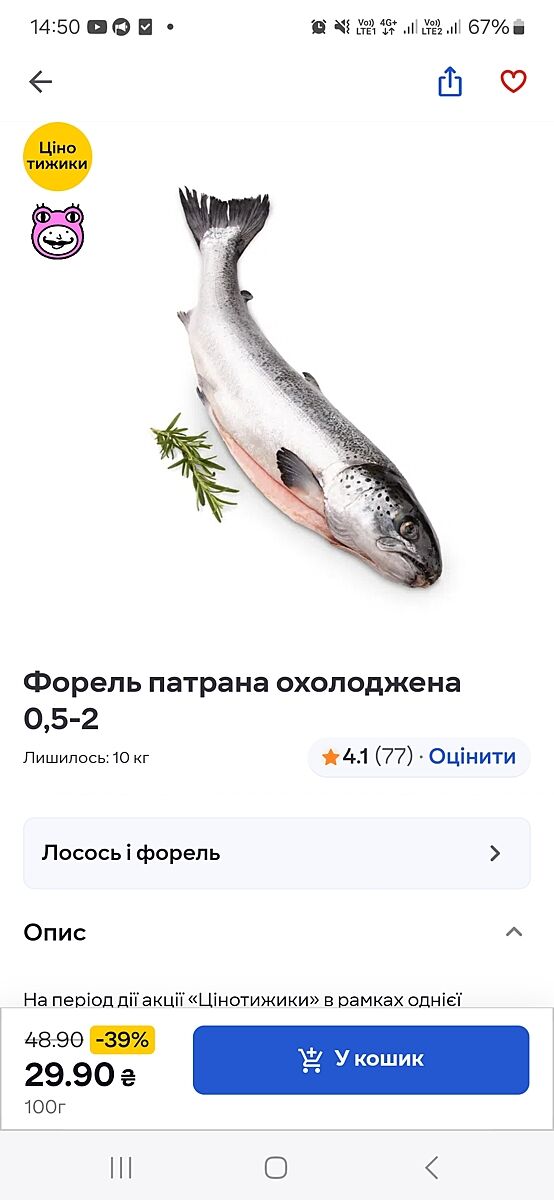 Купувала цю форель. Правда не ціла патрана, а хвостові шматочки. При смаженні виділилося багато води і получилось тушкована, а не смажена