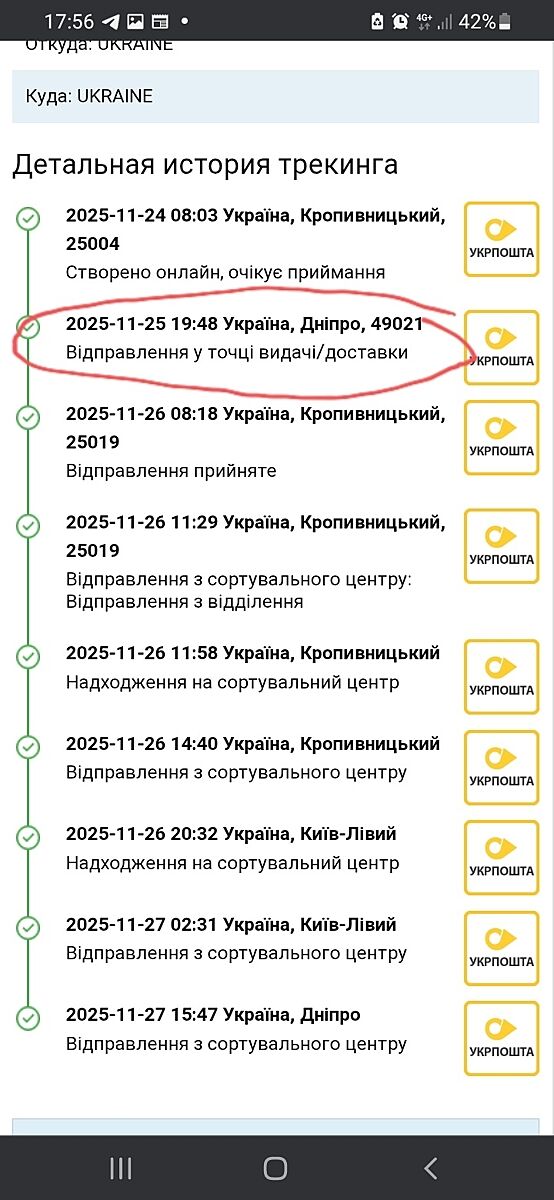 При этом при отслеживании написано что 25.11.25 відправлення в точке выдачи ,как это может быть такое?