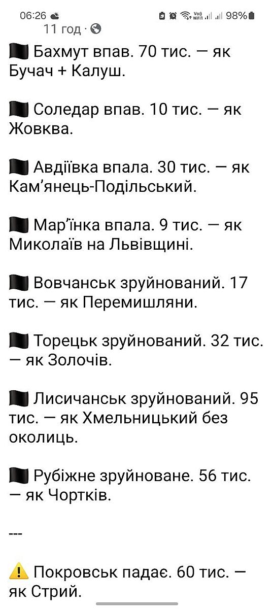 А Ви в шахи граєте в сліпу чи таки дивлячись на дошку? Тому й перепитую, Ви на передовій? Фортеці закінчилися, розумієте, до окупованої території потрапили всі наші міста, що стримували фронт. Тож запитання до Вас, як до людини, що грає в шахи: скільки втримаються фігури на полі, не маючи захисту? І ще, ніхто вже не грає за правилами, наші фігури тупо скидають з дошки.