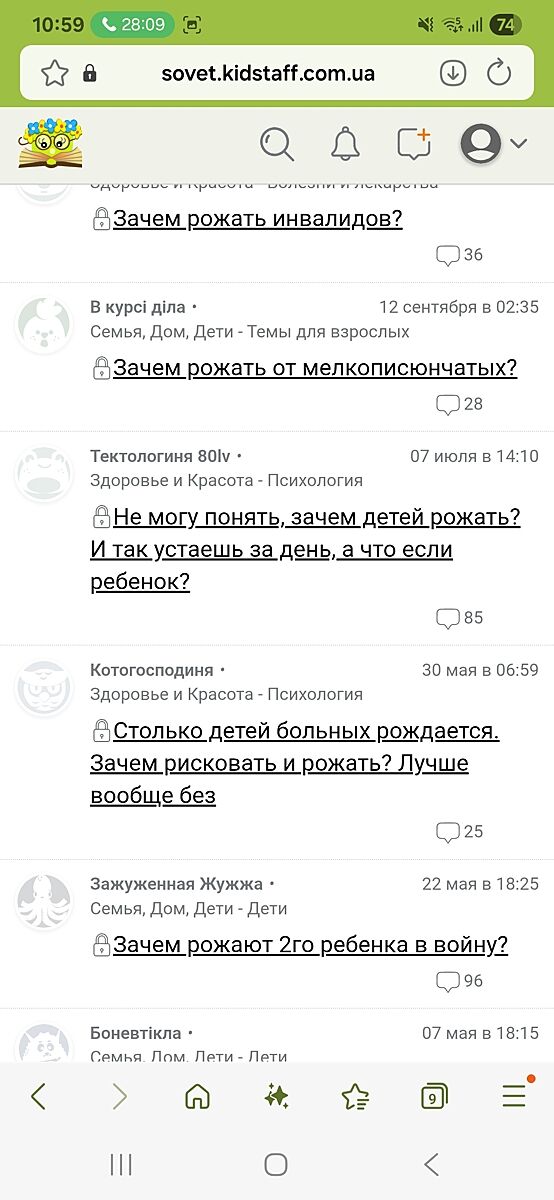 Ой, ну, там не всі теми про війну, там багато жіночок втомлені від того, що нічим не займаються, лише на Совєтчіці сидять, і хвилюються - а якби ще дитина була? жах! Ще он мілкопісячні збоченці про дітей тему склепали...))