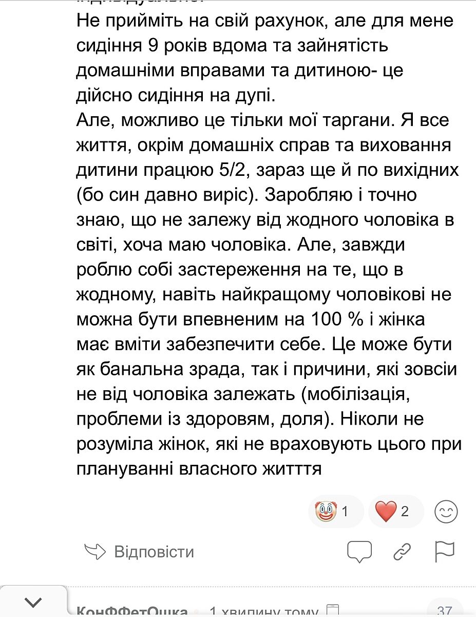 Але, можливо це тільки мої таргани. Я все життя, окрім домашніх справ та виховання дитини працюю 5/2, зараз ще й по вихідних (бо син давно виріс). Заробляю і точно знаю, що не залежу від жодного чоловіка в світі, хоча маю чоловіка. Але, завжди роблю собі застереження на те, що в жодному, навіть найкращому чоловікові не можна бути впевненим на 100 % і жінка має вміти забезпечити себе. Це може бути як банальна зрада, так і причини, які зовсіи не від чоловіка залежать (мобілізація, проблеми із здоровям, доля). Ніколи не розуміла жінок, які не враховують цього при плануванні власного житття