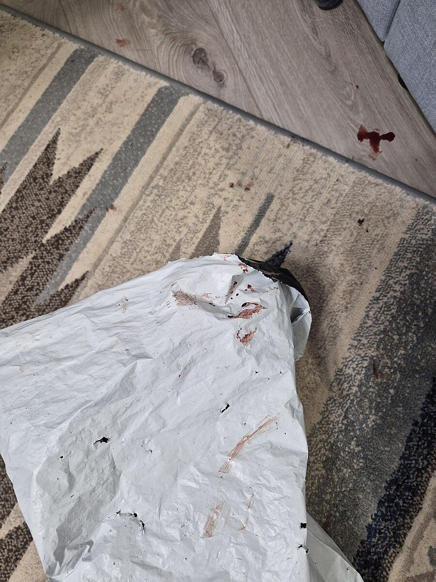 Утром нахожу возле дивана лужицу крови, на ковре и пакете тоже пятна крови