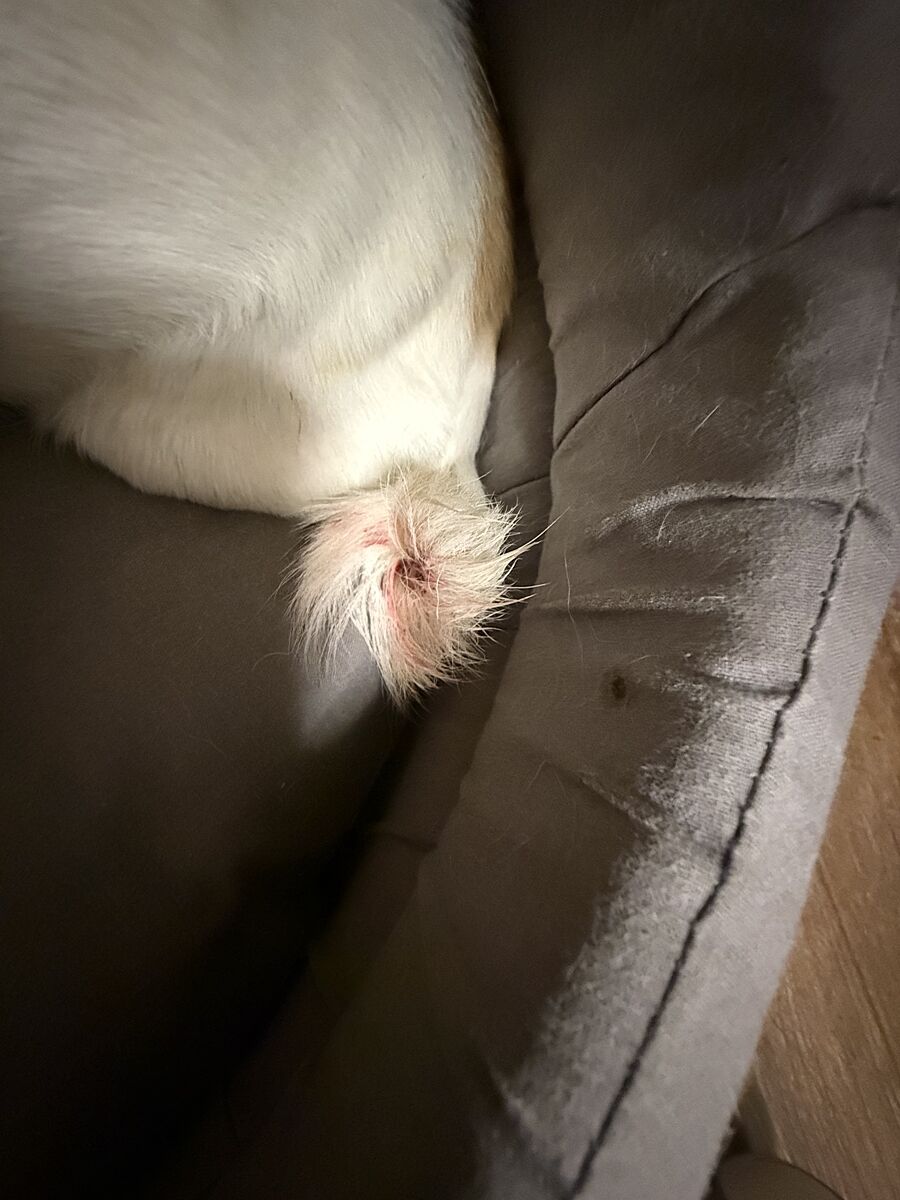 Хвост не травмировали? Она могла находясь дома одна, отгрызть его край? Нет такой привычки у неё, крутиться по кругу за хвостом?