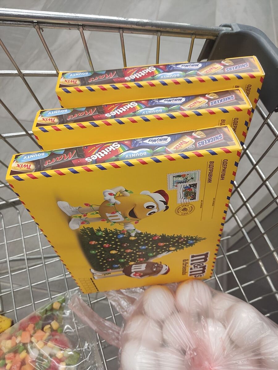 + мандаринки та по шоколадці ще. Молодщій ще мишку нову для ноута, та духи старшій. емемдемс набори, а третя коробочка -чоловіку - але половину з´їм я