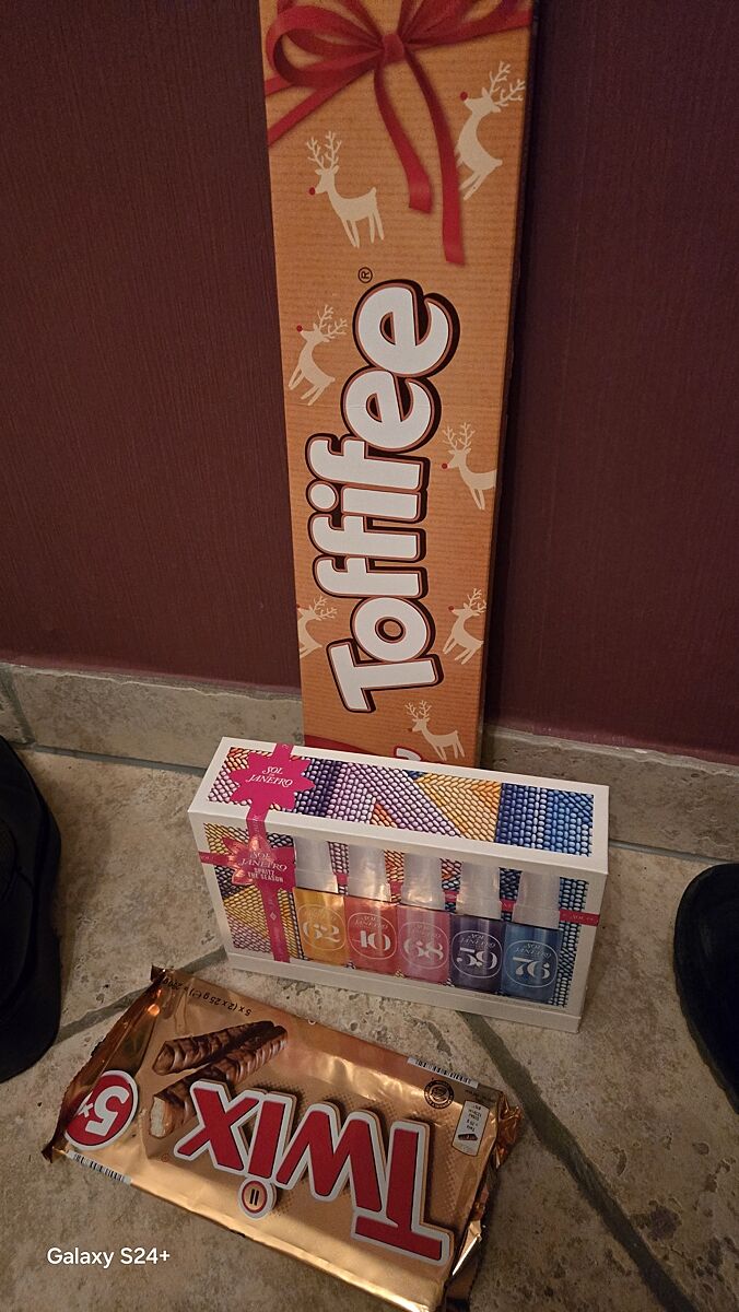 Это подарок для старшей, у младшей-такой же. Большие коробки конфет сын купил сёстрам. Он получил гель для душа, конфеты и парфюм. Ему отдала вчера вечером, так как он рано сегодня уехал и приедет только в воскресенье