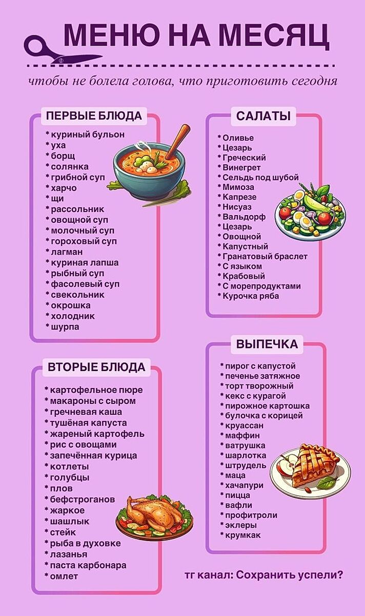 Я спонтанна. Але обов´язково риба, варений рис або інша каша. В якісь дні пюре картопляне і котлети ( мала їсть тільки з курки ,щоб м´ясо було прорізане шматочками). Картопля шматочками з приправами з м´ясом ,запечена в рукаві. З не дуже бюджетного паста з морепродуктами. Салати зараз роблю сезонні-з капусти, моркви,яблука. Або просто моркву на терці ,як по корейськи з маслом і приправою