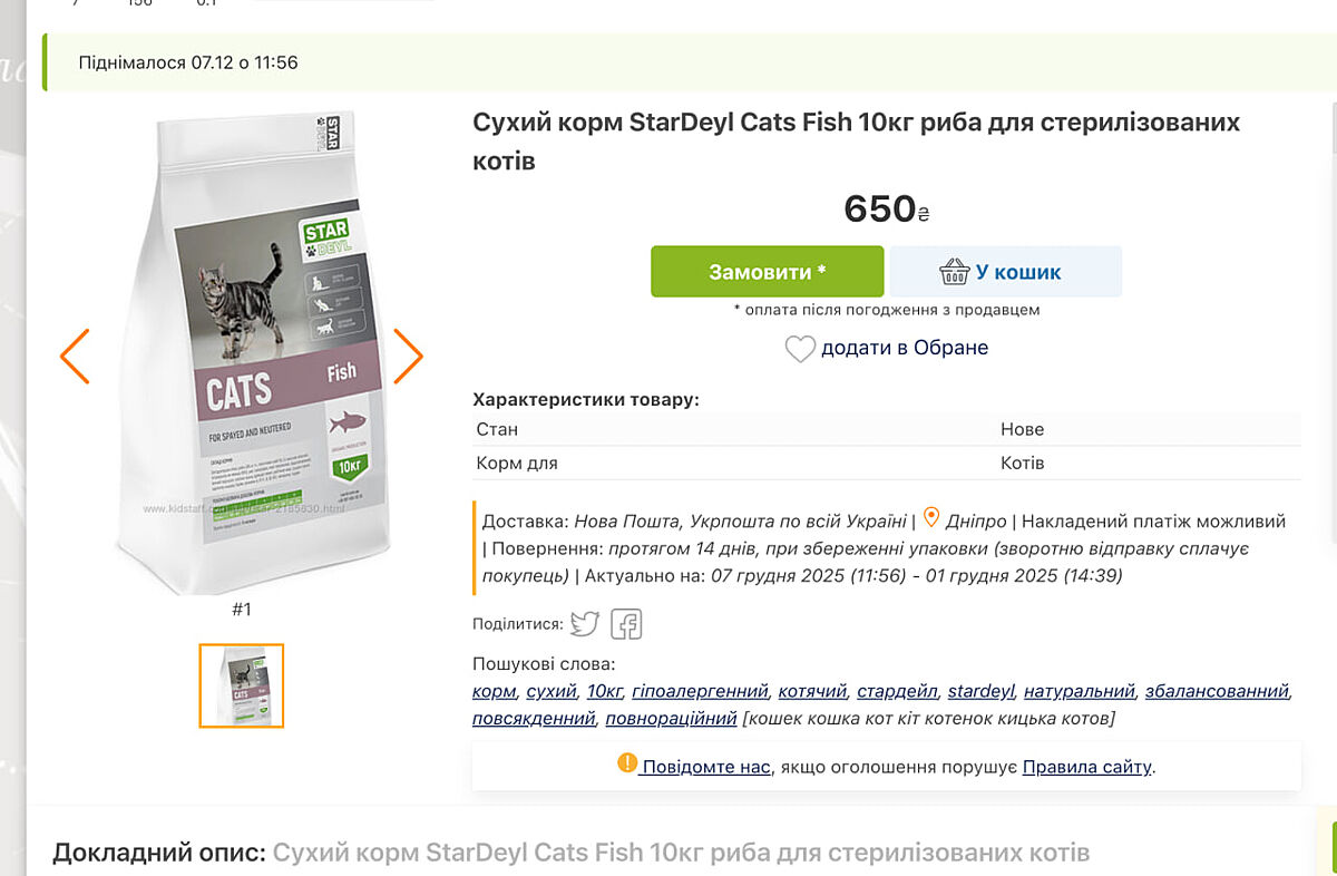 Новий корм, відкритий 5 грудня. Без однієї порції. Випадково замовили не той корм, до якого звикла кішка.