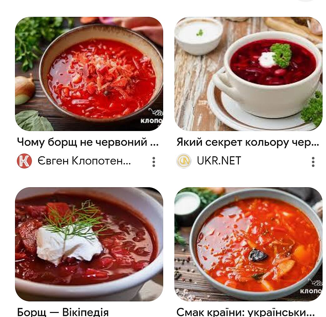 От якщо бачу борщ як у правому верхньому кутку,то не їм,він ще і водяний зазвичай,ненаваристий. Хто до чого звик)