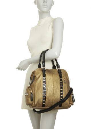 Форма как раз модная, под прада этого сезона, три отделения. Но золотистый цвет и к нему золотые заклепки меня саму озадачили.