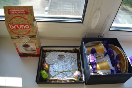 В коробочке было: кофе итальянское, буду гостей угощать, очень кстати) А сама крышечка украшена хен-мейдом лапусичек деток, я так понимаю :)