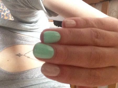 Я делаю однотонный, на правой руке только средний и безымянный в другом цвете. Сейчас нежно телесный и два мятного цвета - очень мило смотрится!