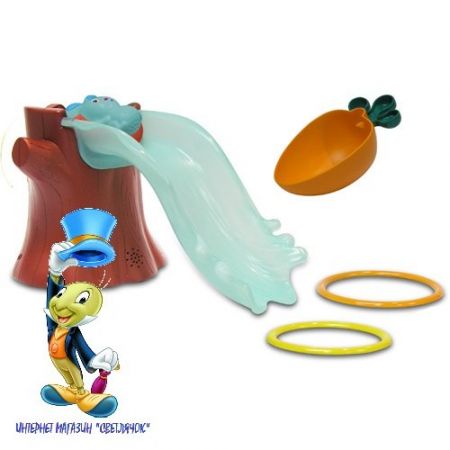 Забавная интерактивная игрушка подарит малышу множество минут веселой игры. Бани обожает водные процедуры! А для более веселого купания у него есть водная горка. Набери с помощью специальной морковки воду в дерево и смотри, как Бани радостно съезжает с горки. При контакте с водой Бани издает забавные звуки. С помощью присоски горку можно надежно закрепить в ванне или на стене. Игрушка имеет функцию автоматического отключения для экономии заряда батарей. Питание: 3 батареи LR44 (входят в комплект).