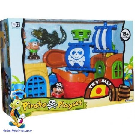 - В комплекте набора включены пиратский корабль, шлюпка, морская крепость, фигурки капитана и двух пиратов, а также крокодил.