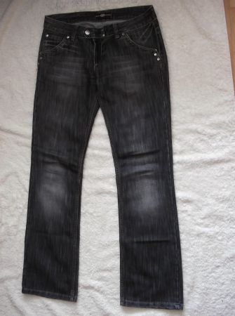 4, 5. Джинсы серые с потертостями, узкие, талия занижена. Длина 102, внутренний шов 81, ПОТ 43, ПОБ 50. Почти не тянутся. Внешних дефектов не нашла.