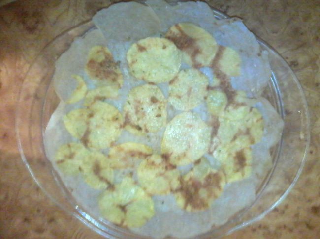 Доделала... Первые 2 фото это просто без пергаментной, лучше так не делать :) Прилипло всё к стеклу ели отшкребла, вторые 2 фото на пергаменте, всё легко снялось. Кстати в этот раз накрывала крышкой специальной для микроволновки получились хрустящие и прожаренные :) Мощность та-же 100 % и 8 минут. Может можно и меньше.....