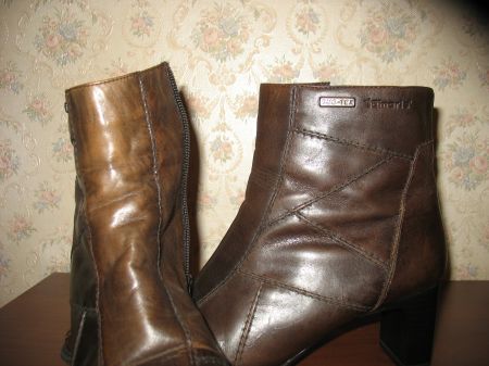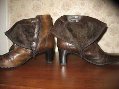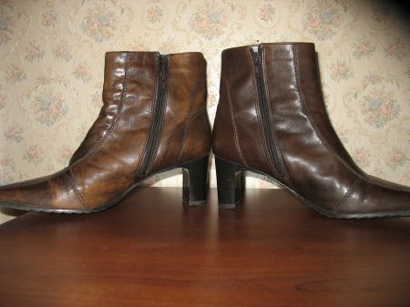 Стелька около 26,3 см, на узкую ногу, носочек тоже немного заужен, максимум на 38,5 размер (написано 38 размер). Полусапожки коричневые, но не совсем однотоннная покраска, в некоторых местах кожа ’потертая’, больше видно ’потертостей’ на правом сапоге. Высота каблука около 6,5 см, высота от верха каблука (начало пятки сзади) до верха сапожка - 13 см, полуобхват голенища - 13 см.