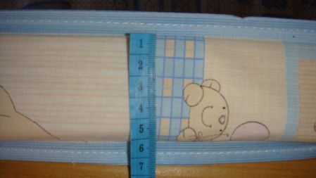Защита с дефектом ребенок начал наступать на нее когда научился перелазить через бортик кроватки. по этому поотрывались завязки,6 шт одну пришила, потом вспомнила, что иногда завязки не совпадали с рейками тоисть Вы можете пришить так, что бы идеально подходили под Вашу кроватку.