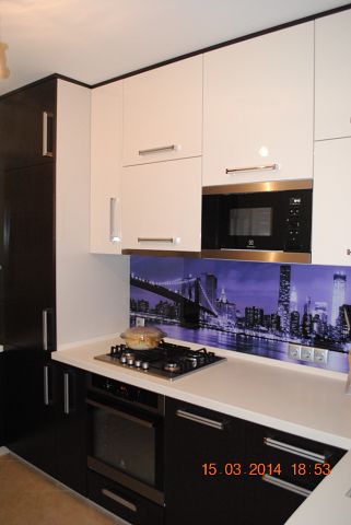 Отличная кухня! У меня будет такая же цветовая гамма, только белый внизу, а темный вверху ( т.к. пол у меня темный, венге). А подскажите у Вас нет вытяжки? Или она строена в шкаф? на фото не видно.