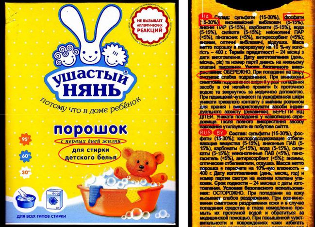 І навіть нема претензій до виробника. Він чесно про все попереджує. Правда, дуже дрібним шрифтом. Починає з фосфатів. Їх тут біля 30%. Цікавить інше: чому татусі і мами не читають ці попередження і не задумуються, що дитячий одяг, випраний цим порошком викликає слабке (або й не слабке) подразнення шкіри у їх немовлят. І як не двояко написано(!): не «може викликати слабке подразнення», а «викликає слабке подразнення». Ствердно. На 100%. Чесно! Просто покупці цього порошку або не читають дрібно написане, або затуркані байдужі люди, які легковажать здоров’ям своїх дітей.