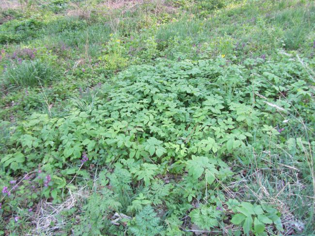 Вот еще одна съедобная трава - сныть. Она уже достаточно большая, я на днях нарвала молоденькие листочки. Я не знаю съедобна ли она в сыром виде, но в борщ вместо капусты и в пироги она вполне хороша.